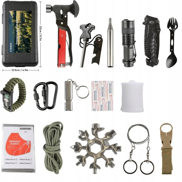 DIDELIS IŠGYVENIMO RINKINYS XXL yra visapusiškas komplektas, skirtas išgyventi miške ir kalnuose , taip pat naudingas atostogų metu ir bet kokioje avarinėje situacijoje . Visi įrankiai supakuoti į praktinį, vandeniui atsparų dėklą , užtikrinantį lengvą transportavimą ir apsaugą.