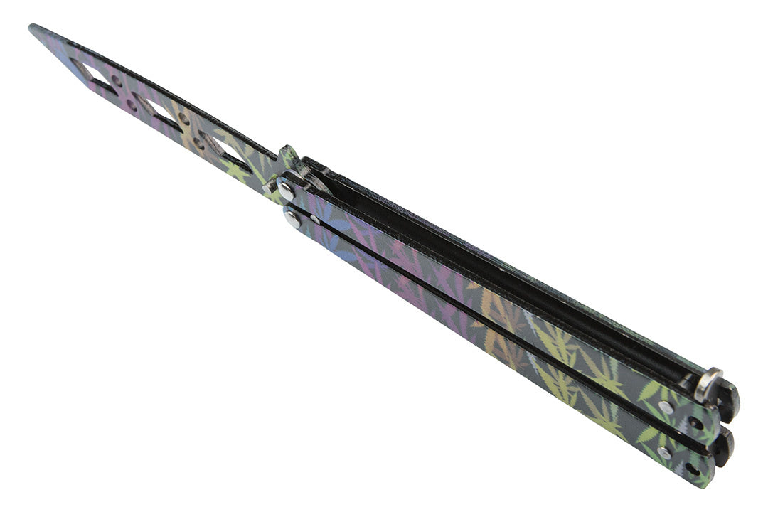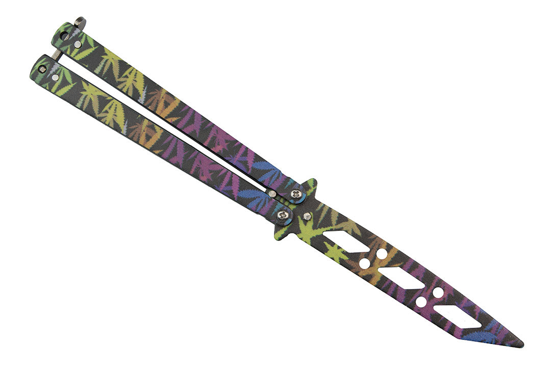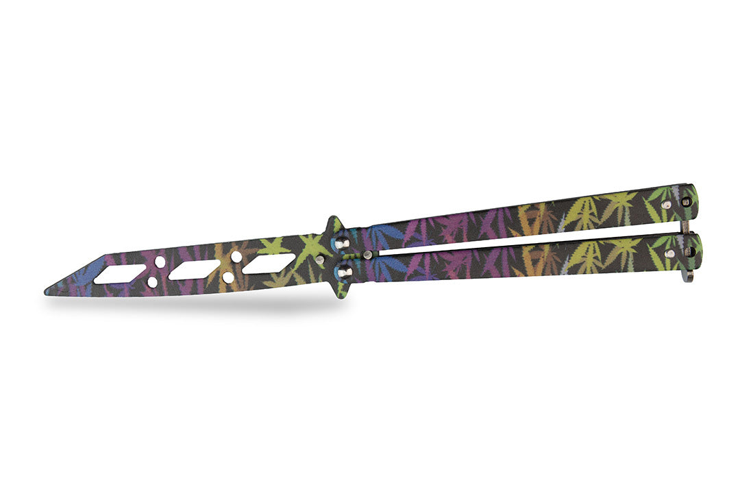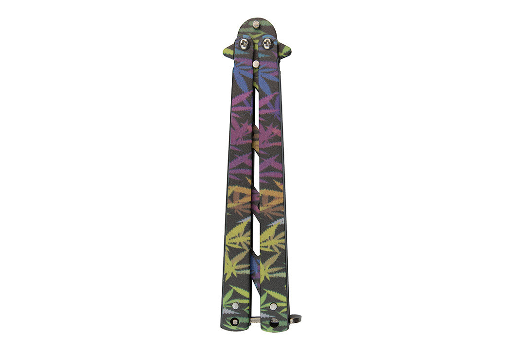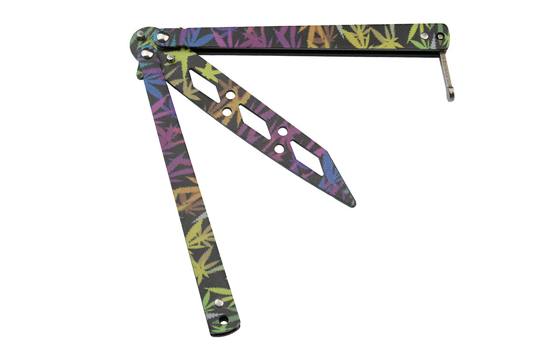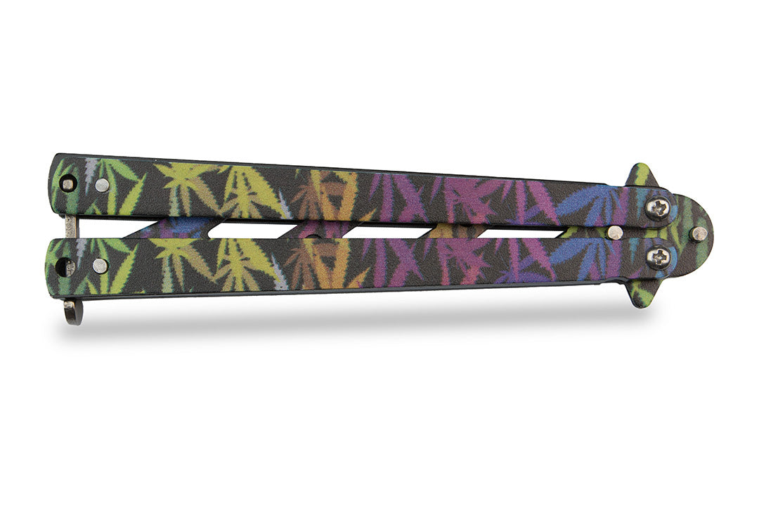 Klasikinė rankena yra marginta spalvingais marihuanos lapeliais.