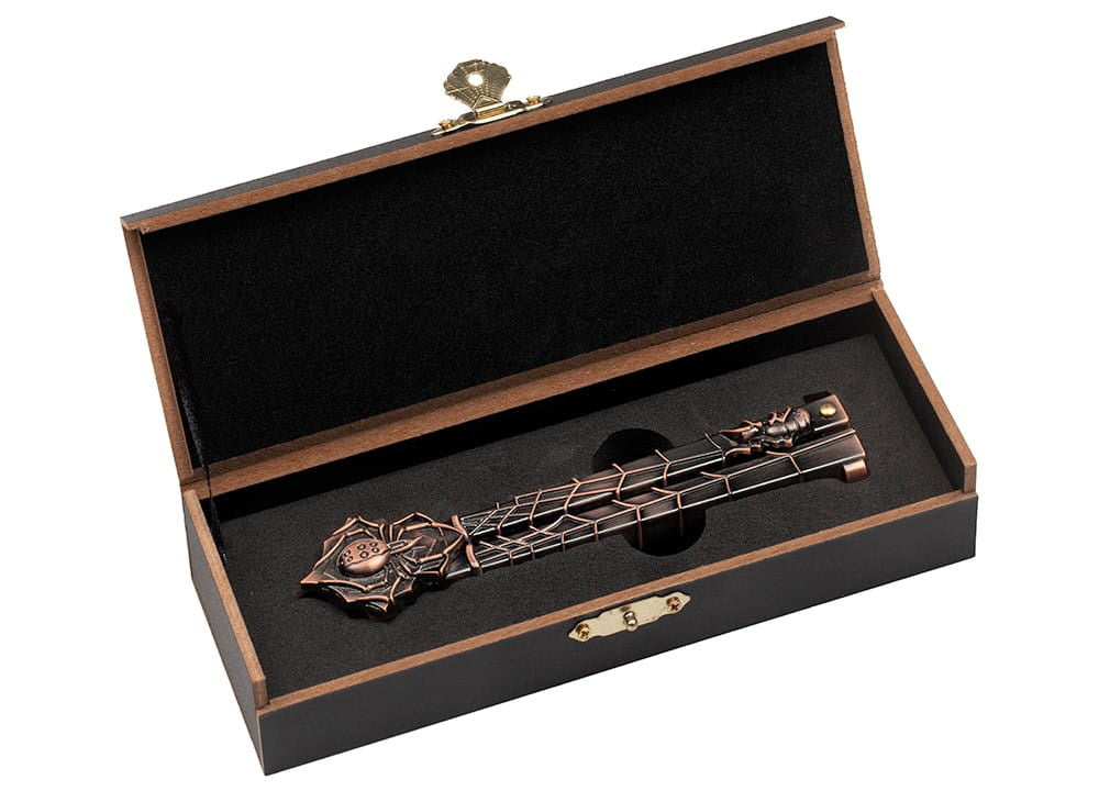 Į komplektą įeina juoda medinė dėžutė su metaliniu skląsčiu, nudažyta voro motyvais.