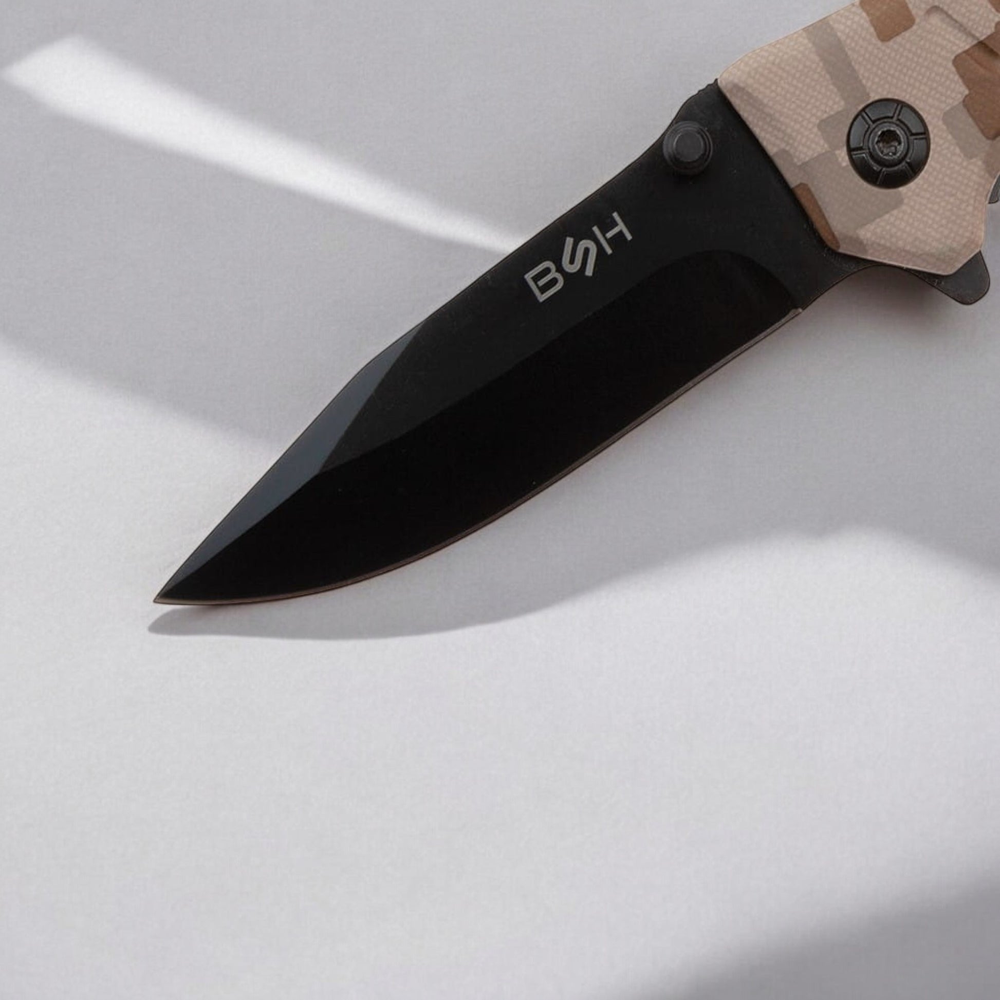 Aukštos kokybės geležtė: ašmenys pagaminti iš nerūdijančio plieno (420 tipo), atsparaus korozijai — patikimas net drėgnomis, purvinomis ar sudėtingomis sąlygomis.