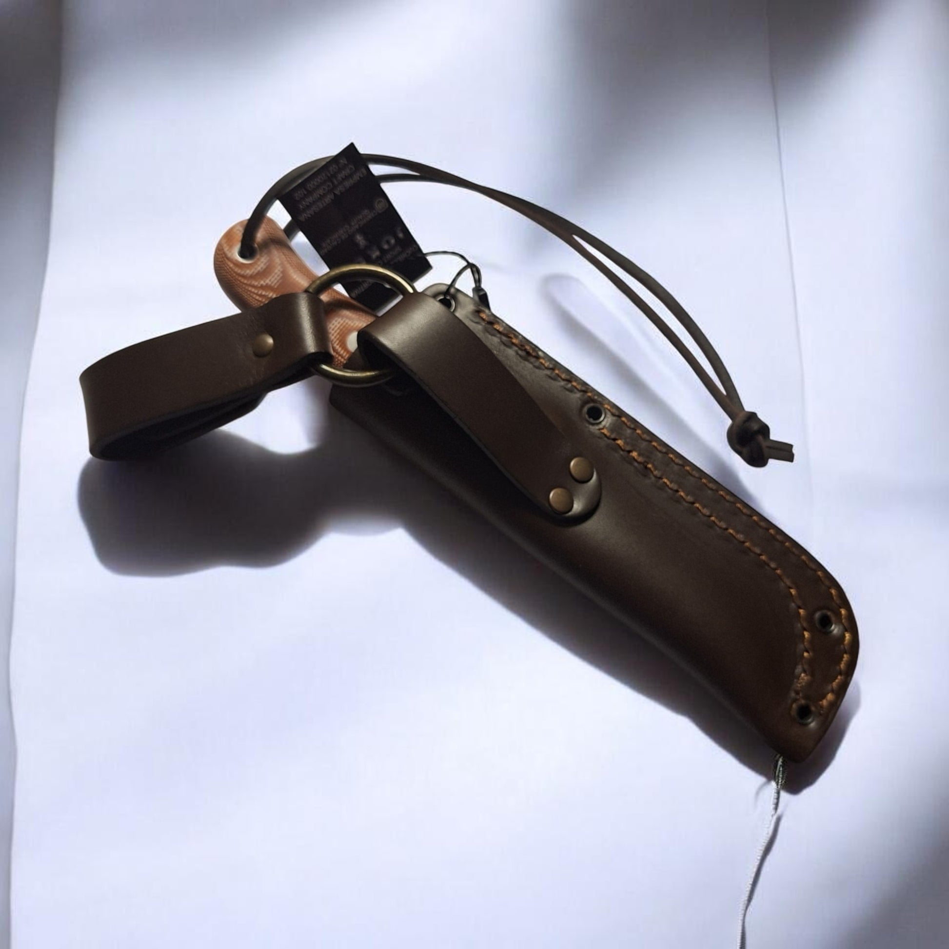 Peilis komplektuojamas su kokybiška ruda odine makštimi, kuri leidžia saugiai ir patogiai nešiotis peilį dirže.