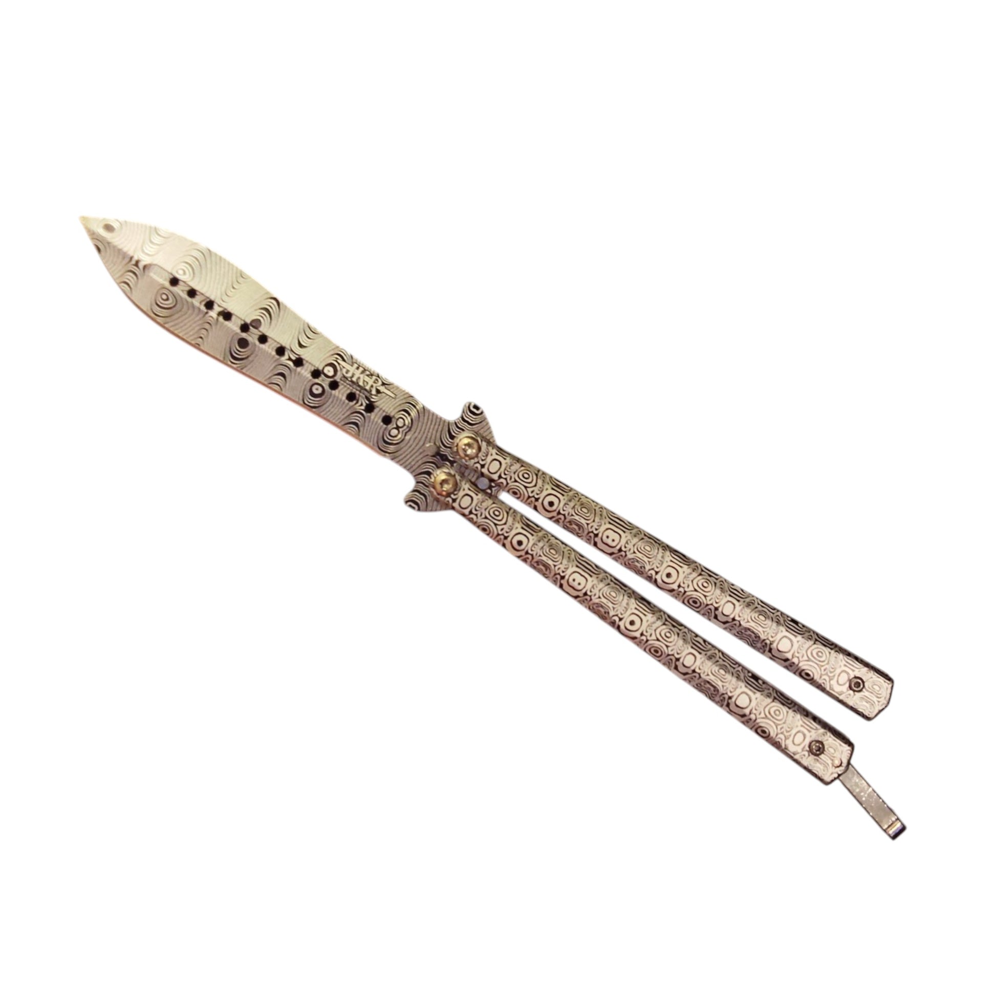 Joker JKR0644 – tai drugelio tipo (balisong) sulankstomas kišeninis peilis, pasižymintis išskirtiniu dizainu ir patikima konstrukcija. Vienpusiai šlifuota nerūdijančio plieno geležtė padengta apsaugine danga, kuri padidina atsparumą korozijai ir suteikia modernią išvaizdą.