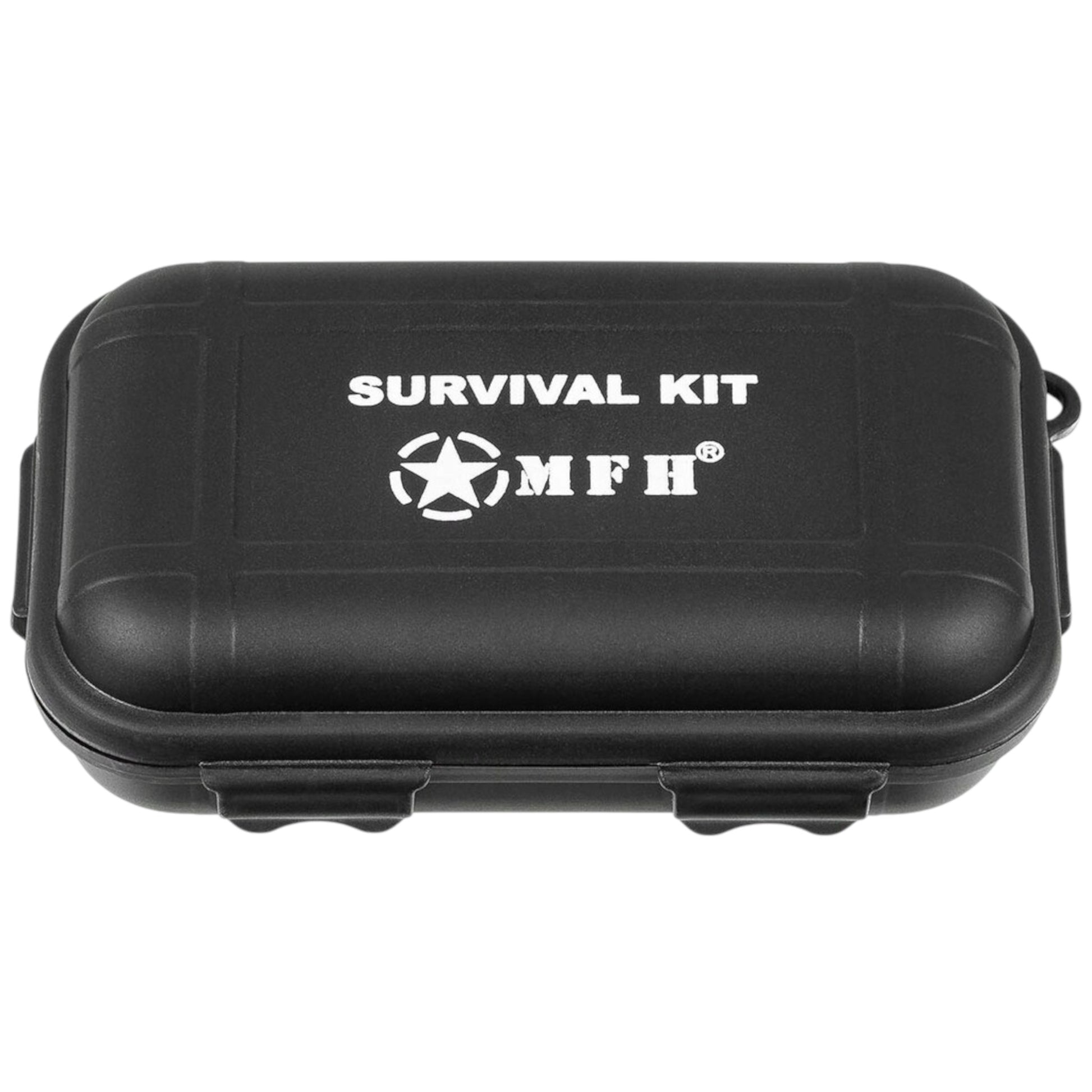 MFH 14-os vienetų išgyvenimo rinkinys yra universalus ir patikimas komplektas, skirtas lauko ekspedicijoms ir ekstremalioms situacijoms. Visi elementai dedami į vandeniui atsparią ir patvarią, juodos spalvos ABS plastiko dėžutę (matmenys 13,5 x 8 x 4 cm . Dėžutė yra lengva, bet užtikrina turinio apsaugą nuo pažeidimų ir drėgmės.