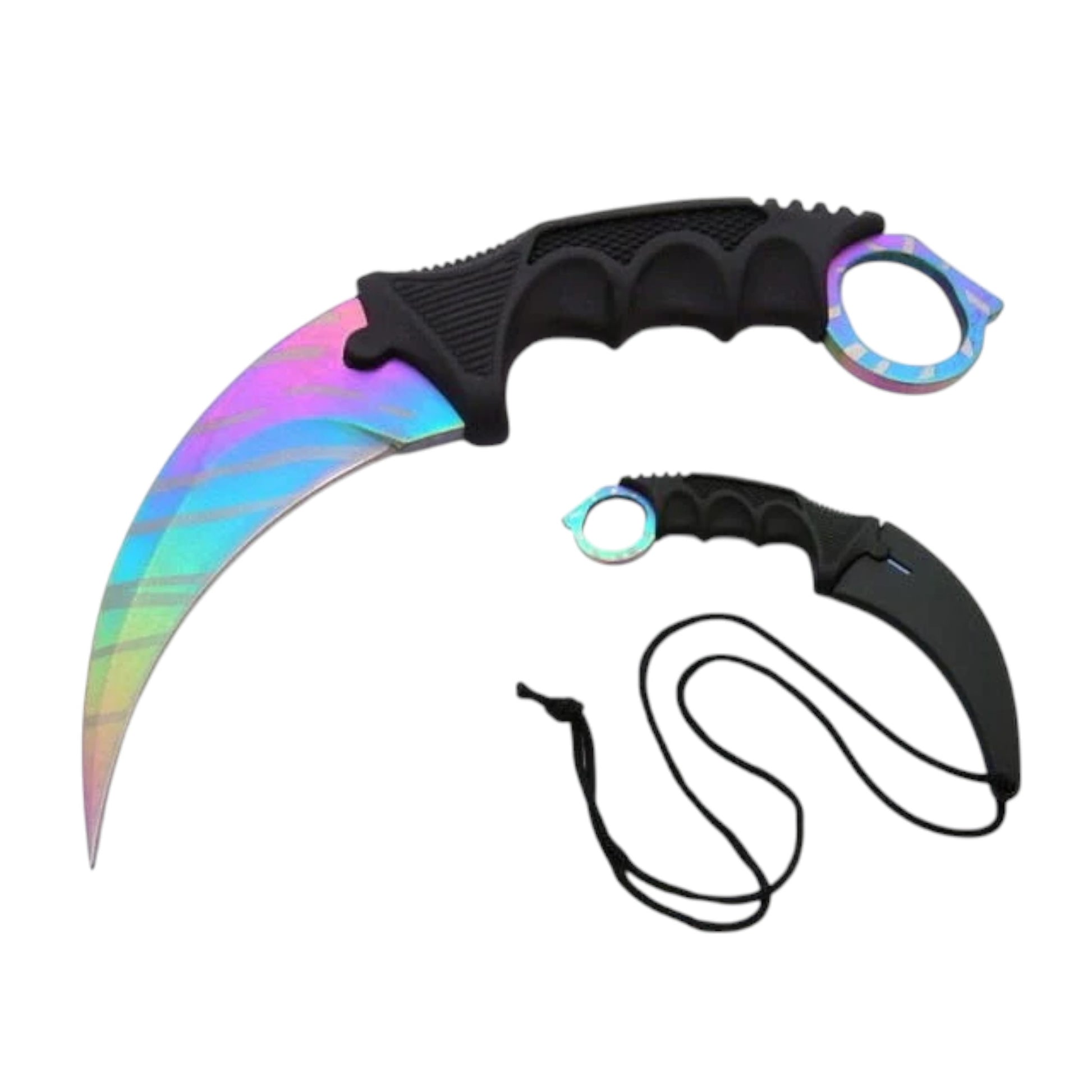 Komplekte yra juodas ašmenų užvalkalas , kurio dėka peilį galima pakabinti ant kaklo.